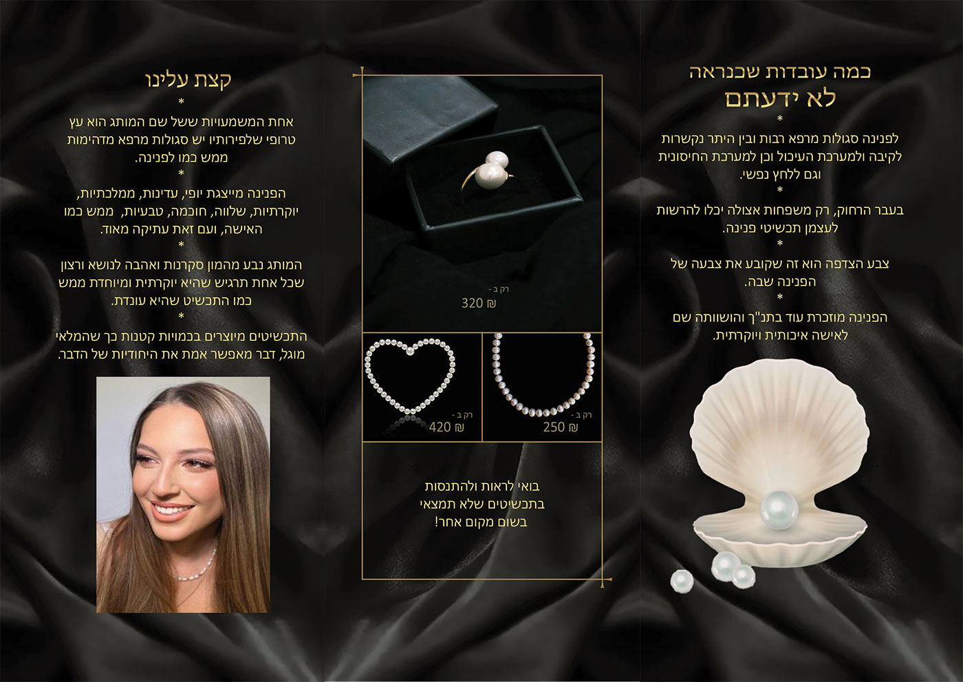 התכשיטים מעוצבים בעבודת יד והמתמחה בפנינים קלאסיות בשילוב עיצוב מודרני. המיתוג תוכנן לשדר אלגנטיות, יוקרה ועדינות נשית, ולהתכתב עם עולם הפנינים: טבעי, נקי ועל־זמני.